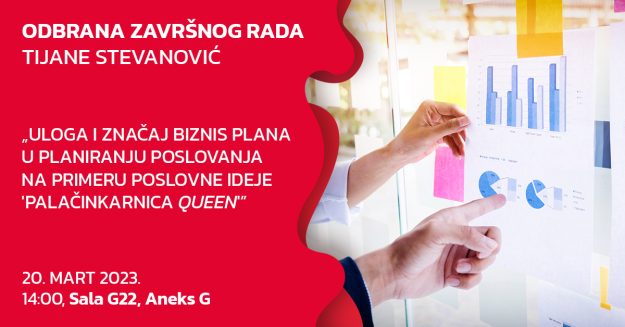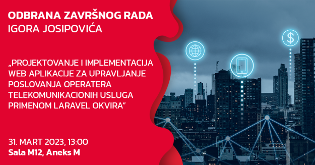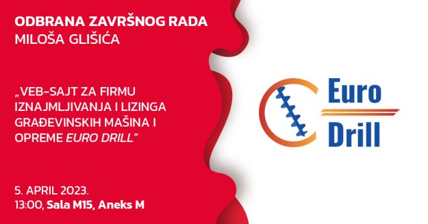 Sa zadovoljstvom vas obaveštavamo o terminu odbrane završnog rada kolege Miloša Glišića i ujedno vas pozivamo da se pridružite ovom događaju. Odbrana završnog rada kolege Miloša Glišića pod nazivom „Veb-sajt za firmu iznajmljivanja i lizinga građevinskih mašina i opreme Euro Drill” kod mentora dr Marka Nikolića održaće se u sredu, 5. aprila 2023. godine, s…